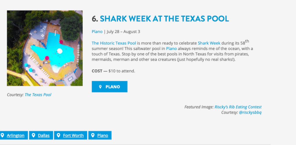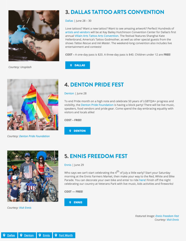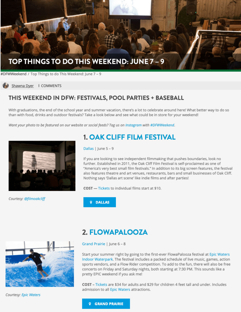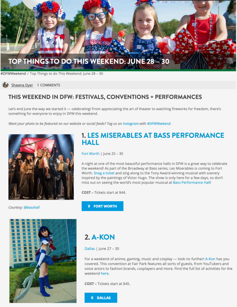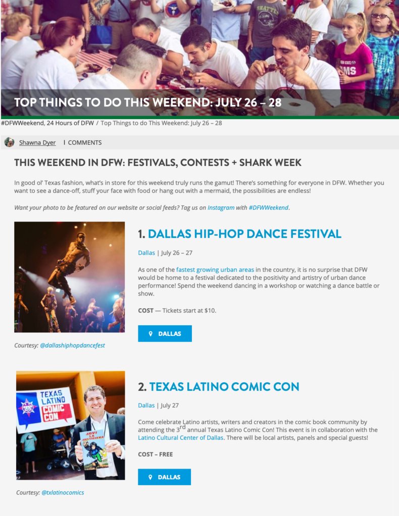I interned at VisitDFW for the Summer of 2019. I spent most of my summer researching events in the DFW area and finding what was worthy to travel to the area for. I also helped to source images for the articles I wrote.