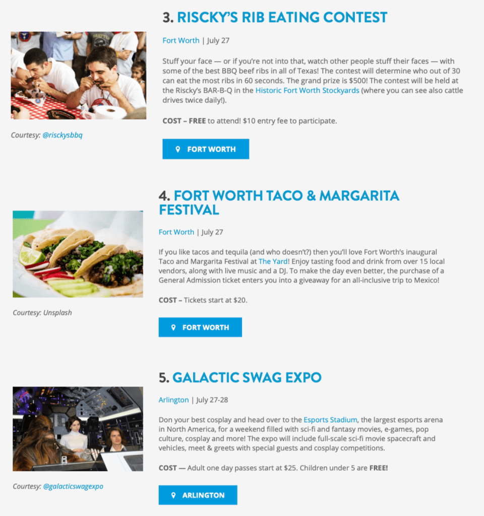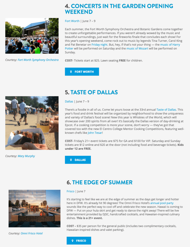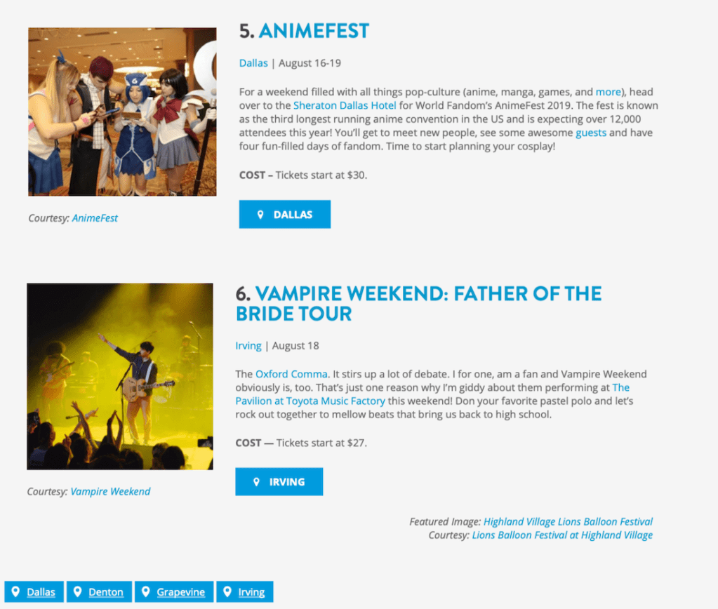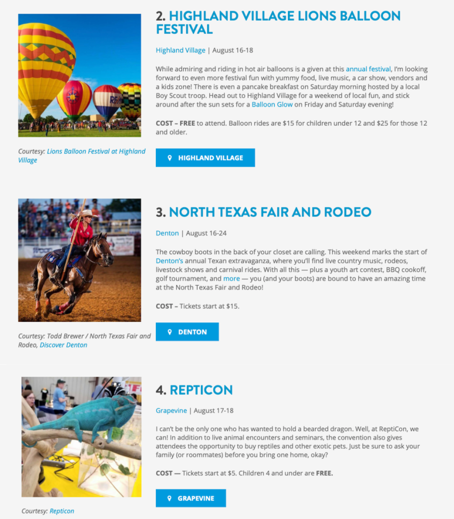 I interned at VisitDFW for the Summer of 2019. I spent most of my summer researching events in the DFW area and finding what was worthy to travel to the area for. I also helped to source images for the articles I wrote.